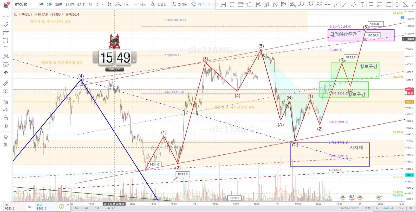 다음 4시간봉이 0.382를 돌파하면서 단기이평선을 돌파하면서 상승할지? 이후 중기이평선을 돌파하면서 상승세를 이어갈지?