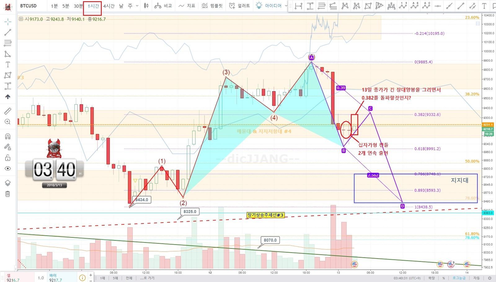 1시간봉을 기준으로 분석해보면 2시간연속으로 십자가형 캔들을 만들면서 매수세와 매도세가 박빙으로 싸움을 벌인듯 합니다..